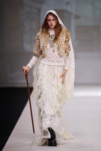 大概是羊毛针织面料。它非常柔软,而且可以创造出丰富的质感。在很多系列中,我都运用了不同的针织结构。我们制作了很多看起来像蕾丝,但实际上是针织的面料。我认为这种变化既保留了中世纪的韵味,又非常现代。