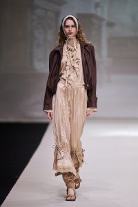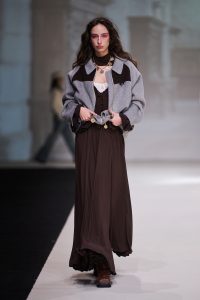 这种直觉也体现在面料的选择上。她说,该系列主要采用羊毛针织面料,因为羊毛柔软舒适,而且能够营造出丰富的质感。有些面料看起来像蕾丝,但实际上是针织而成,这既保留了中世纪的韵味,又赋予了服装现代感。她还特别指出,最后一套造型最能代表本季:一件针织与雪纺拼接的连衣裙,搭配饰有激光蕾丝细节的麂皮夹克,将柔美与力量完美融合。