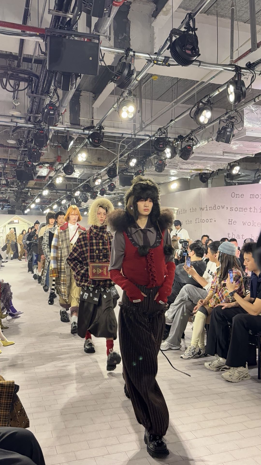 这一理念贯穿了整场秀。该系列并没有将童年仅仅作为装饰性的元素,而是将其视为一个充满自由、想象和独处的空间。秀场布置立刻清晰地传达了这一点。墙上贴满了泛黄的旧故事书页,而小巧的房屋状结构则将整个场地营造出介于童话场景和私人回忆之间的氛围。模特们在空间中穿梭,仿佛置身于一本打开的书页之中。